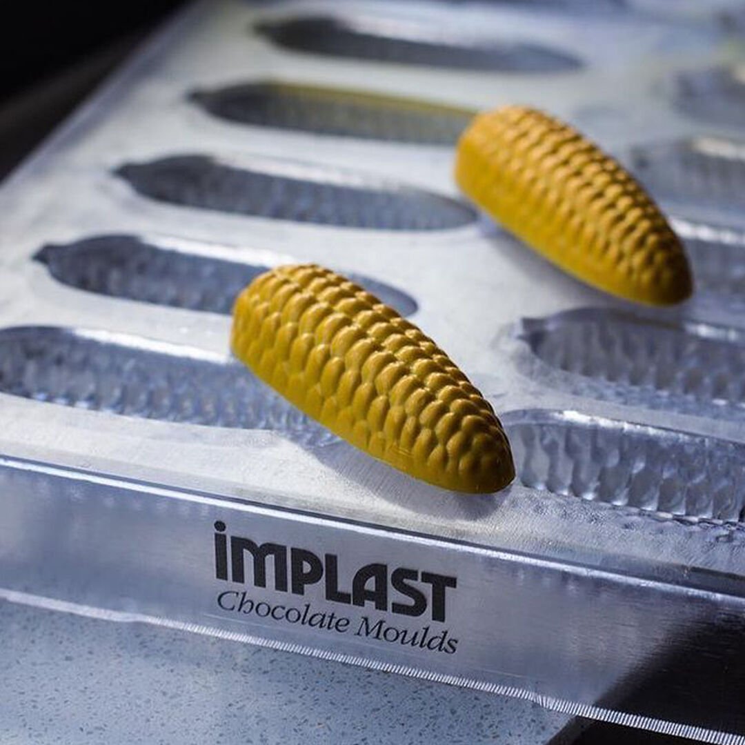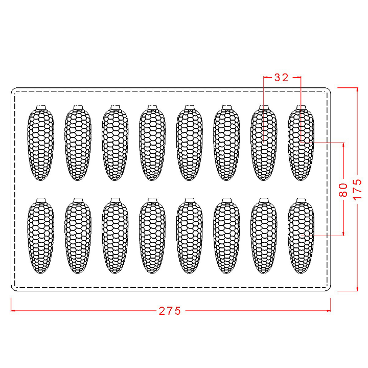 Yüksek kaliteli polikarbon materyalden üretilen bu kalıp, 275 x 175 x 25 mm ölçülerindeki standart gövdesi içerisinde 16 adet (2x8 dizilim) ürün dökülmesine olanak tanır. Pürüzsüz ve detaylı iç yüzey tasarımı, çikolatanın kalıptan kristal parlaklığında ve mısır tanesi figürlerini en ince ayrıntısına kadar koruyarak ayrılmasını sağlar. Butik atölyeler ve yaratıcı sunumlar hazırlayan şefler için karakteristik bir ekipmandır.
