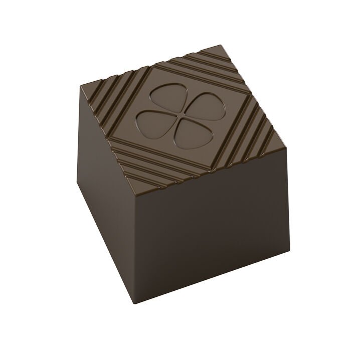 Kare Spesiyal Çikolata Kalıbı No: 1014, klasik kübik formu üst yüzeyindeki zarif dört yapraklı çiçek motifi ve ritmik çizgisel detaylarla birleştirerek sunumlara geleneksel bir şıklık katar. 22,5 mm ölçülerindeki simetrik yapısı, yüzeyindeki bu karakteristik işlemeler sayesinde her bir parçanın prestijli birer mühür gibi öne çıkmasını sağlar.